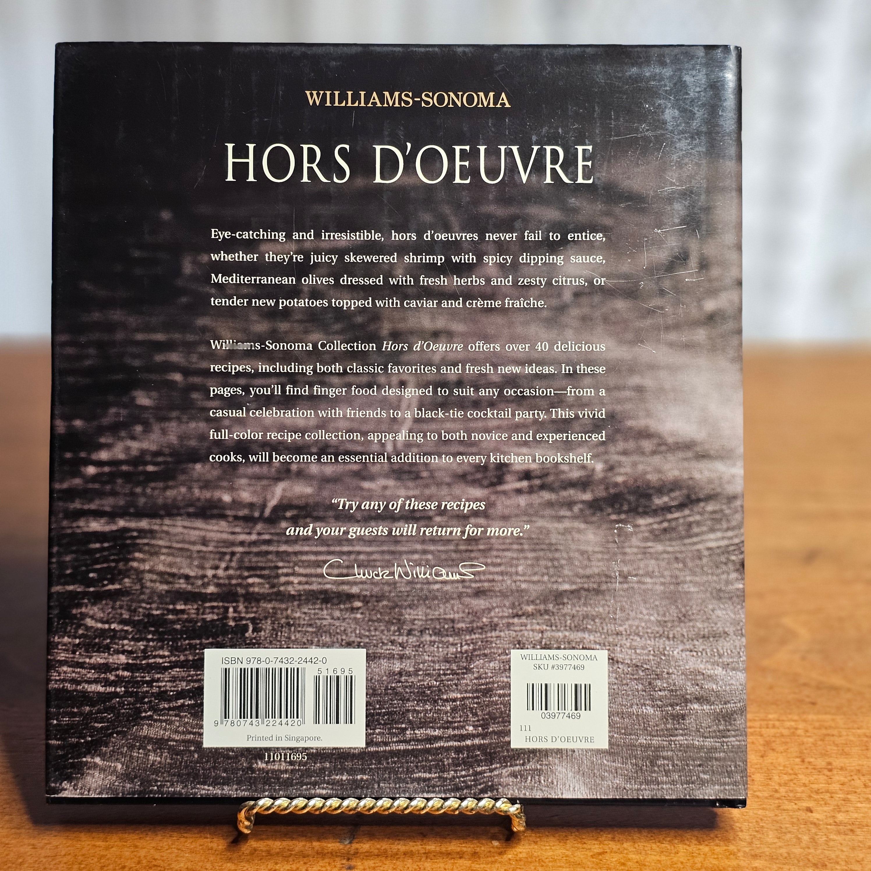 Williams Sonoma Hors D'oeuvre Cookbook Last stock! Williams Sonoma Hors D'oeuvre Cookbook Product form 1 in stock $10.00 Quantity Add to cart This item is a recurring or deferred purchase. By continuing, I agree to the cancellation policy and authorize you to charge my payment method at the prices, frequency and dates listed on this page until my order is fulfilled or I cancel, if permitted. Guaranteed secure & safe checkout.